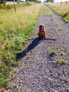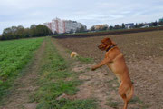 ich schäme mich da schon ein bisschen, weil, ich will doch ein großer Hund sein), dazwischen Gehweg mit tausend tollen Düften - da lässt mir Papa auch immer Zeit. Manchmal aber nimmt er die kurze