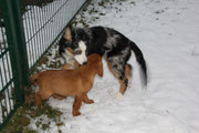 •Dann dies weiße Zeug, das die Menschen Schnee nennen - saustark. Da kann ich wühlen und schnuppern was die Nase hält und nix tut weh - herrlich !